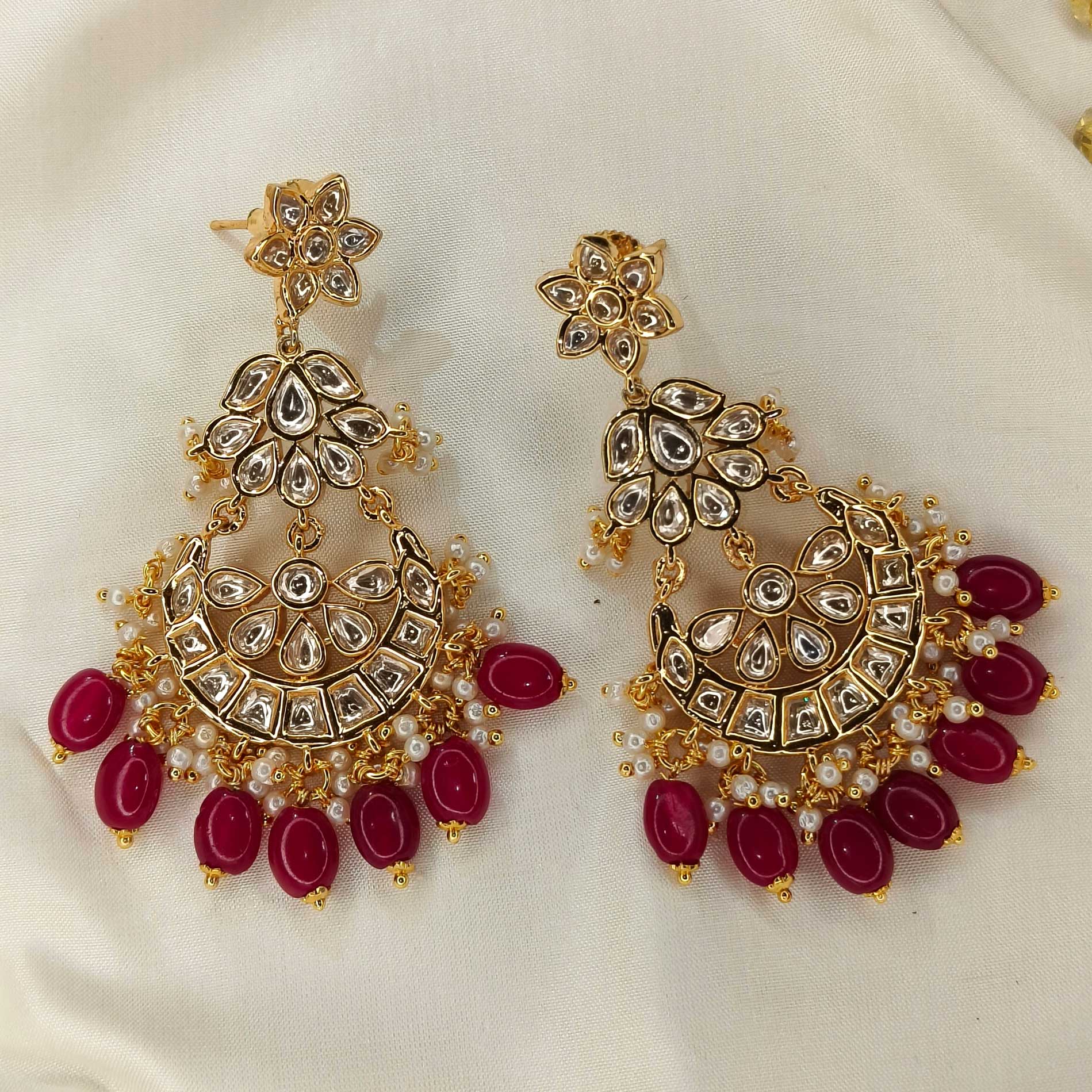 The Kumkum Shruti Chandbali captures the richness of tradition with deep ruby-toned Polki accents in a classic crescent silhouette. Elegant yet impactful, it brings just the right touch of grandeur for weddings, festive evenings, or cultural gatherings.