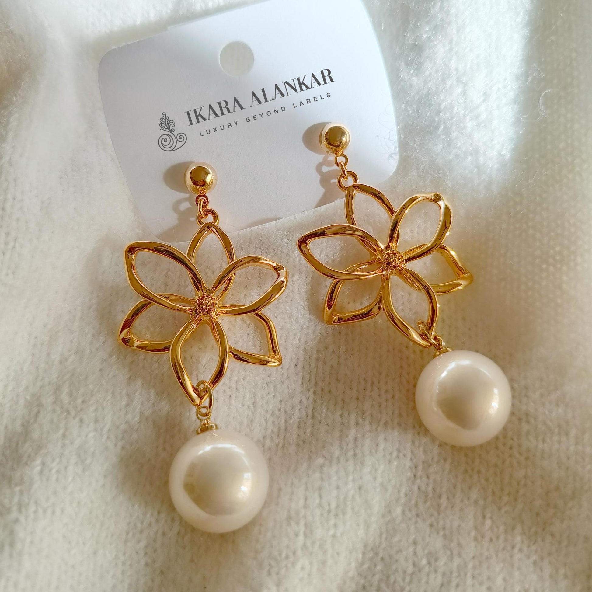 Aurora Pearl Danglers, Classic and graceful, these golden-finish danglers with big pearls exude timeless charm. Featuring a glossy polish and anti-tarnish coating, they are perfect for cocktail parties, festive evenings, or elegant celebrations. Lightweight yet statement-worthy, they bring sophistication to every outfit.