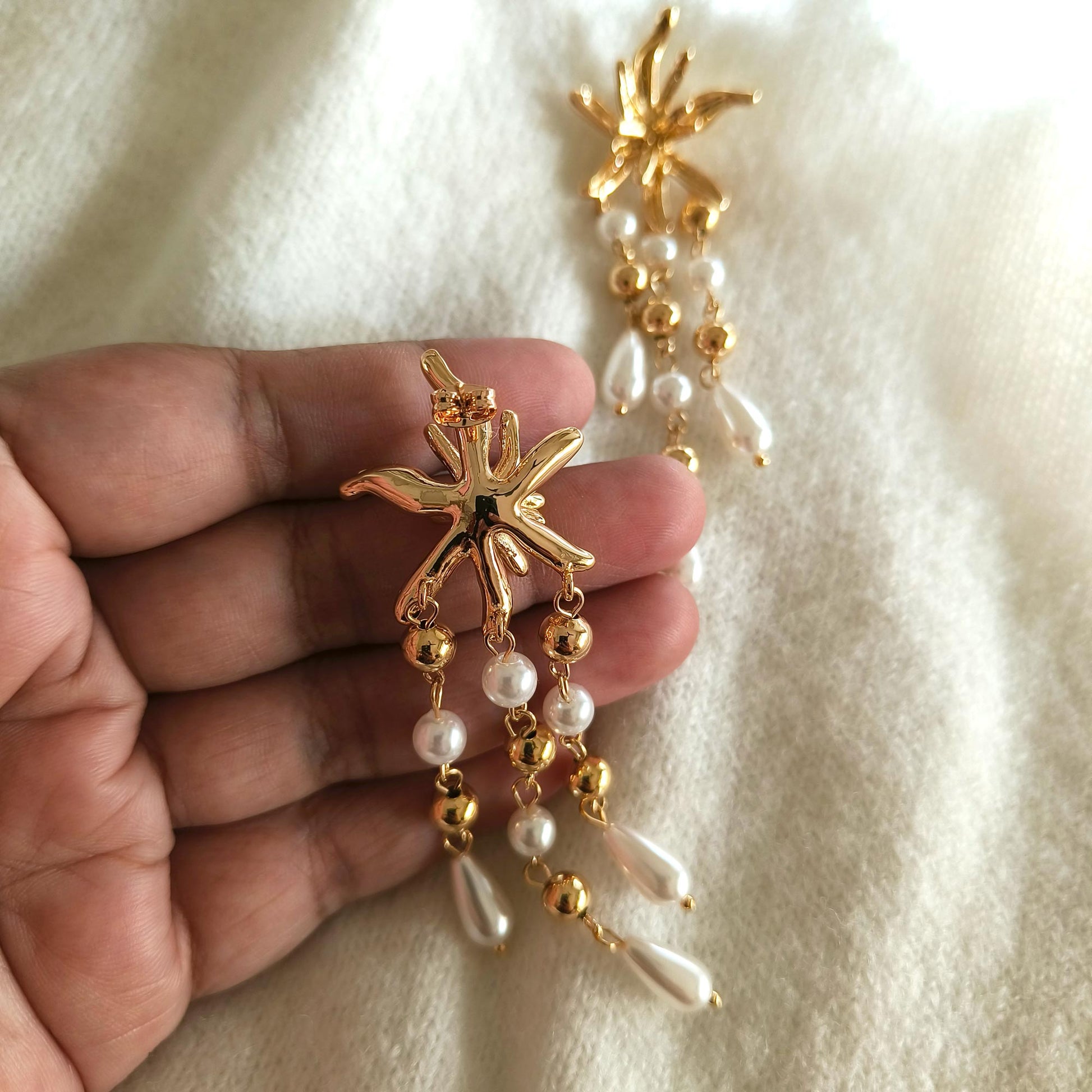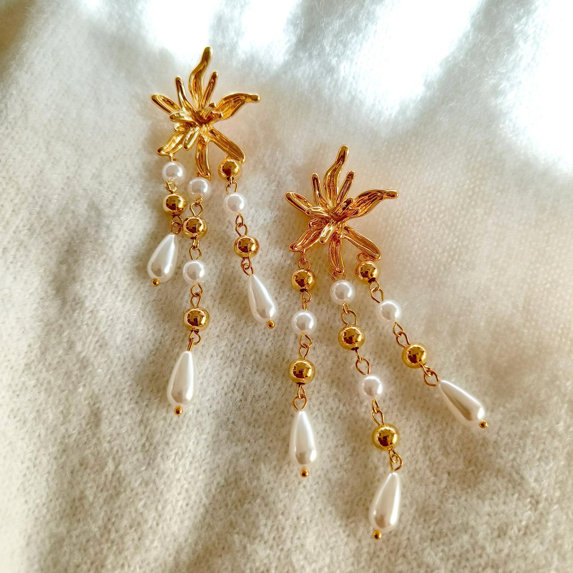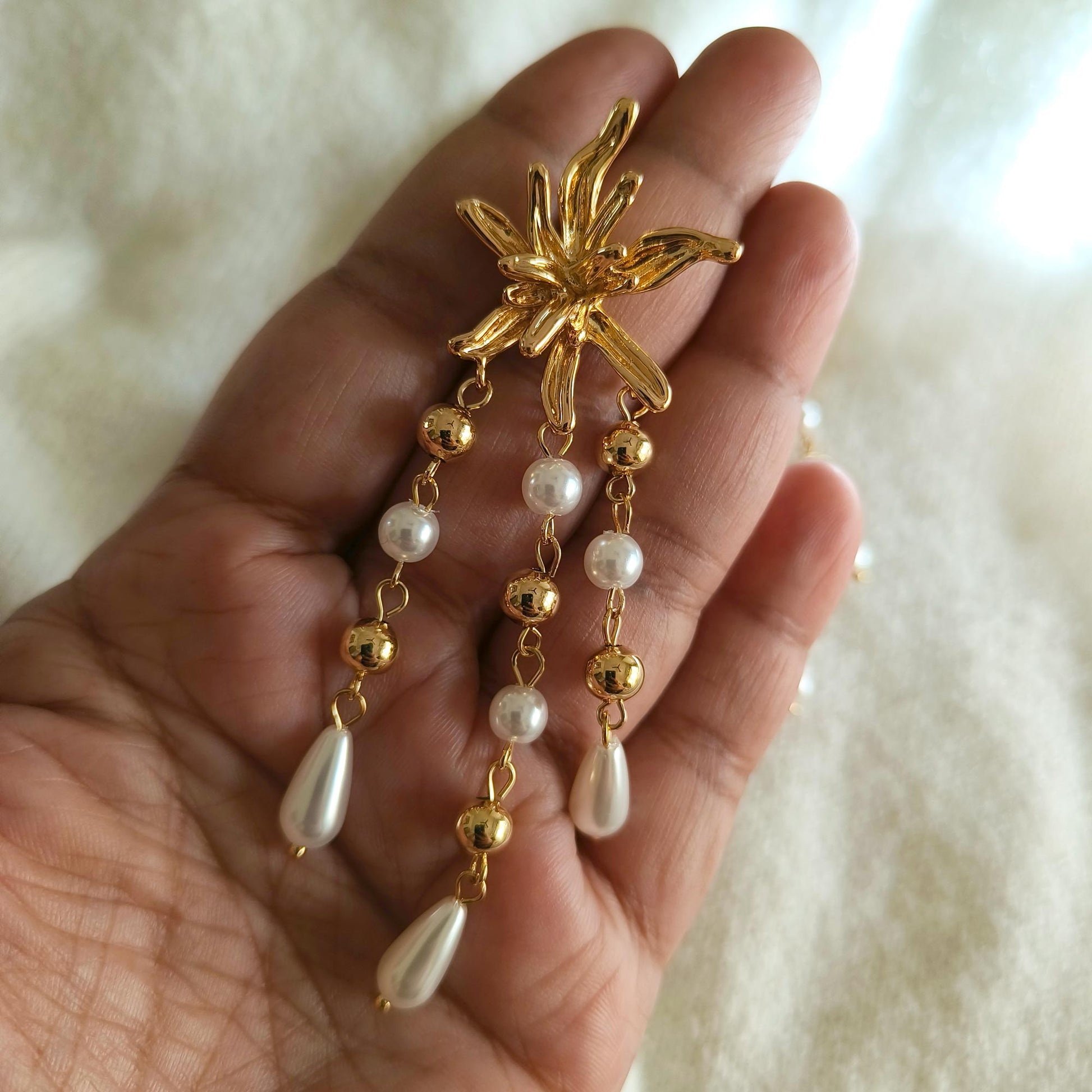 Sea Princess Chandelier, Radiant and elegant, these chandelier earrings feature golden tones with delicate pearl drops, finished with a glossy anti-tarnish polish. Perfect for cocktail parties, weddings, or festive occasions, they add a luxurious, eye-catching sparkle to any outfit.